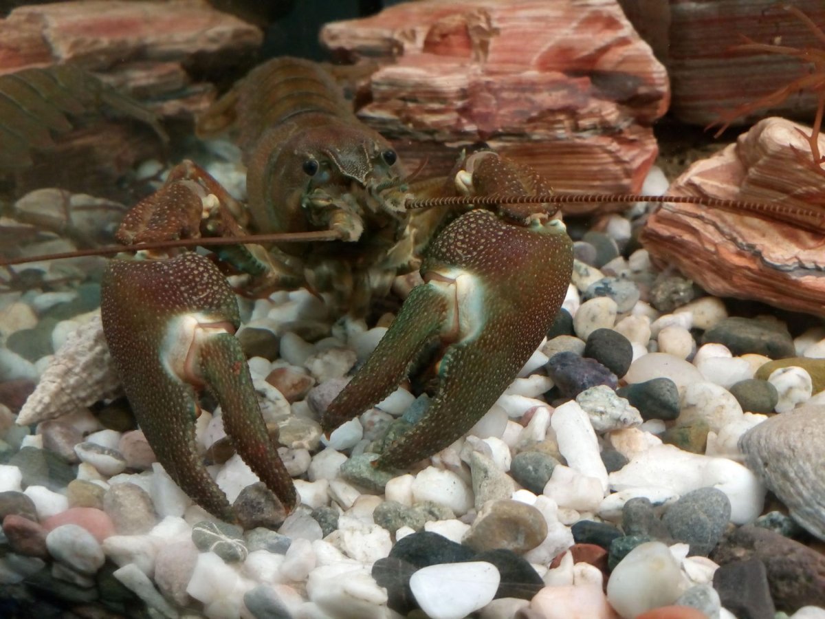 Эти раки хоть и имеют большие - внушительные клешни , но в акве совершенно никого не обижают : ни из окружающих и ни своих сородичей .
