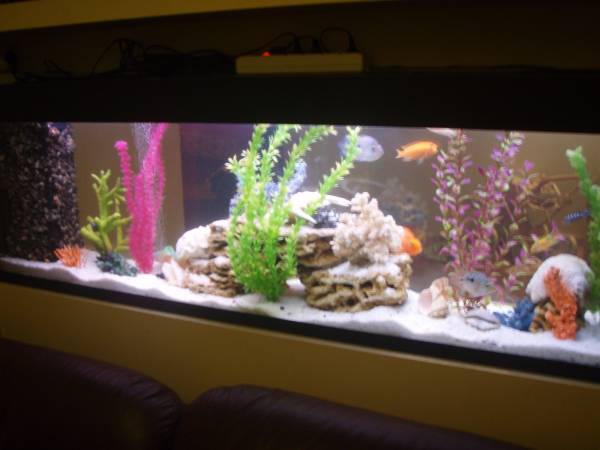 аквариум псевдоморе с цихлидами и кораллами, искусственные растения.