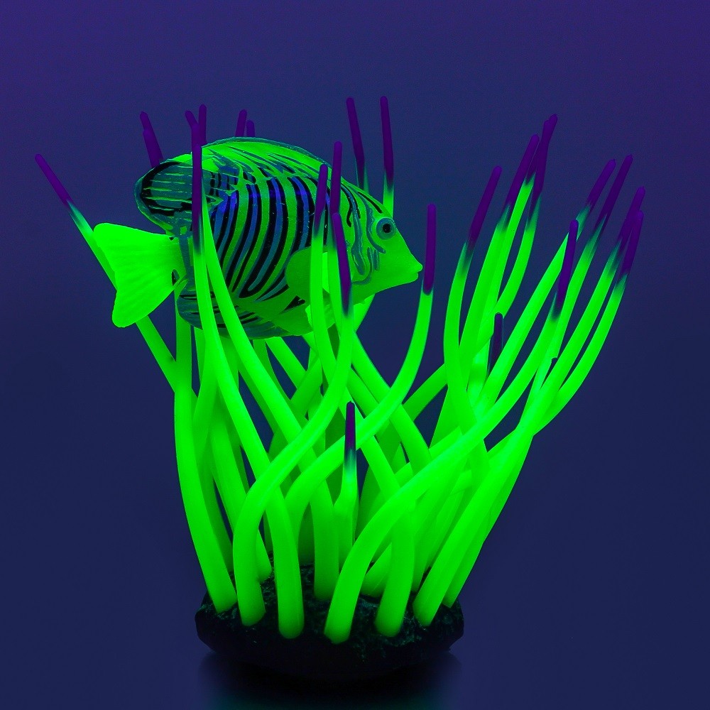 Флуоресцентная аквариумная декорация Рыба хирург в анемоне зеленая, 11х8х12см |