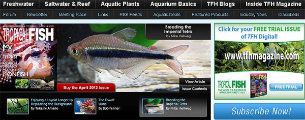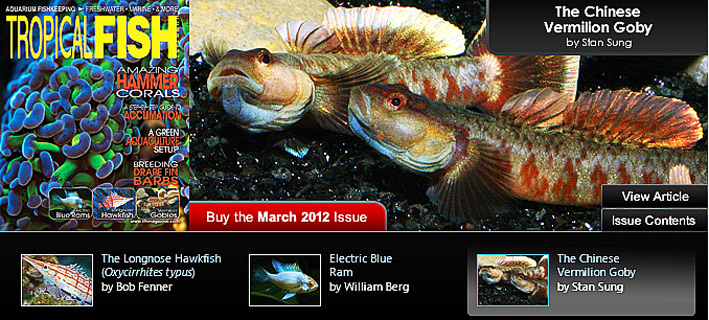 Каждый новый номер журнала Tropical Fish Hobbyist, и мартовский выпуск не исключение, сделан так, что отражает заинтересованность практически сразу всех групп аквариумистов. Традиционная бумажная и цифровая версии журнала, как всегда идентичны. При желании и настойчивости можно связаться с журналом и получить пробный выпуск цифрового издания бесплатно. Здесь и морские объекты и цихлиды и самые последние новинки среди пресноводных, солоноватоводных и морских гидробионтов. Главные статьи марта включают популярных обитателей морского аквариума - кудрепёров, популярных карликовых цихлид - микрогеофагуса Рамиреса и рассказ о совершенно новом китайском бычке-риногобиусе. Длинноносый кудрепёр (Oxycirrhites typus) - автор Боб Феннер. Жизнь в природе, внешние отличия,условия содержания, территориальность, корма и кормление, болезни, размножение и аквариум для длинноносого кудрепёра описаны довольно детально. Голубые рамирези (Microgeophagus ramirezi) - автор Уильям Берг. Рыбы были выведены и широко распространились у аквариумистов в 2009 году. Автор рекомендует избегать приобретения слишком ярких рыб, которых обрабатывают гормонами, что ослабляет их здоровье. Описаны условия содержания, кормления и размножения этой вариации в аквариуме. Китайский красный бычок (Rhinogobius zhoui) - автор Стэн Сунг. Эти риногобиусы были впервые представлены вниманию аквариумистов в 2010 году компанией Rare Fish Inc. Представлены биотопы и природные места их обитания в виде горных речек. Условия содержания в неволе просты. Рыбы не требовательны и едят практически любые аквариумные корма. Известны случаи нереста в неволе, но получить потомство пока не удалось. Раздел аквариумных новостей посвящен исследованию слепых пещерных рыб в Университете Нью-Йорка. Любители редких видео-кадров могут посмотреть, как опасный даже для людей морской моллюск - ядовитый конус нападает на тропическую барабульку и съедает её живьём. Фильм снят Шари Горовицем (Би-БИ-Си) на Большом Барьерном рифе.