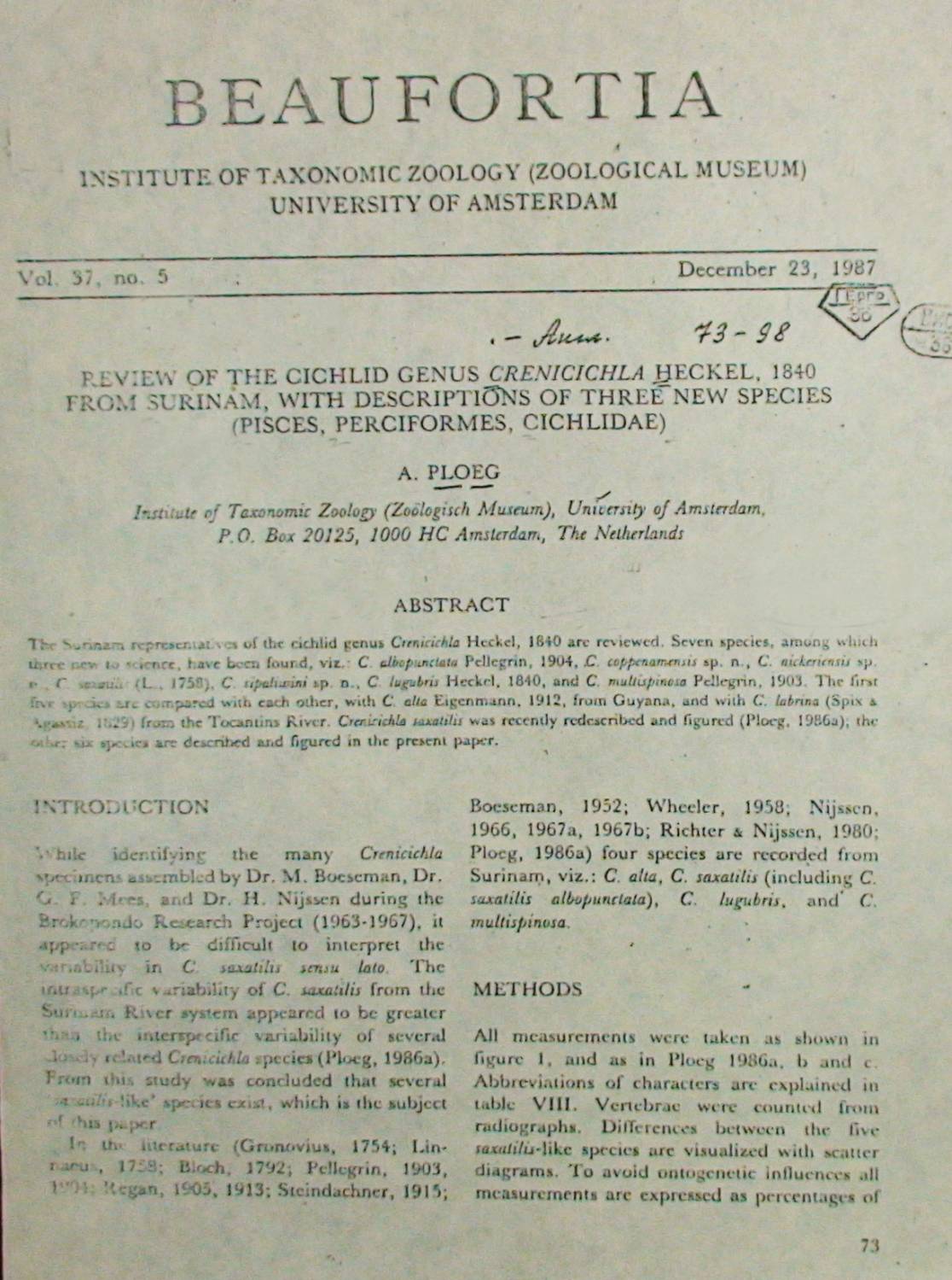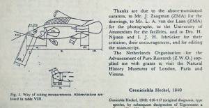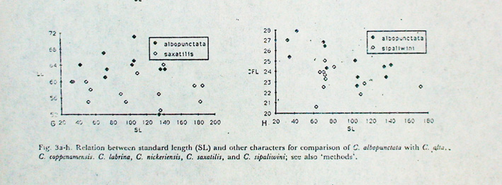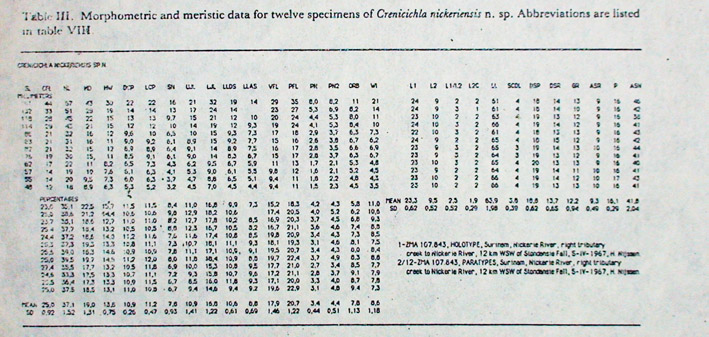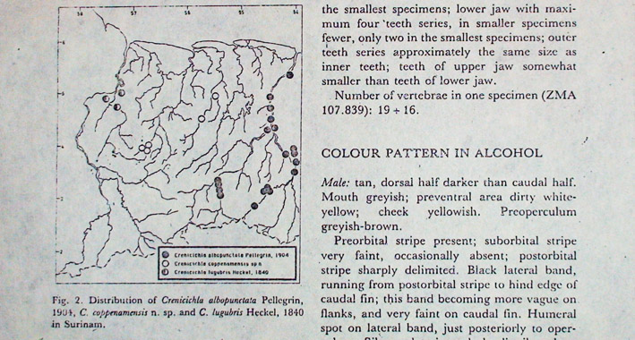 Ни для кого не секрет, что сотни видов рыб, хорошо знакомых аквариумистам, так и не нашли ещё своего научного описания. Яркий пример у всех на виду - это одесский барбус, появившийся впервые у нас в Одессе. Однако в Одессе далеко не тропики и для мировой аквариумистики это была такая же загадка, как и сама по себе СССР, закрытая страна, где аквариумное увлечение было очень популярным и традиционным ещё с дореволюционных времён. "Знатоки" аквариумных рыб относили этого барбуса, то к Barbus ticto, а то даже к Barbus conchonius... Самые опытные и осторожные авторы называли этот вид как Barbus sp. "Odessa I". Одесса 1 потому, что был ещё один вид, который появился одновременно с первым - он получил название Одесса 2. Однако только недавно, спустя 30 лет после своего победоносного (другого слова и на подберу) шествия по аквариумам мира этот вид получил своё настоящее научное описание и название Barbus padamaya. Спросите почему? Ну хотя бы потому, что был неизвестен природный ареал обитания этих красивейших аквариумных рыб. Ведь не Одесса же! А вот Barbus sp. "Odessa 2" был не столь популярен и красив и , поэтому, сравнительно быстро исчез из аквариумов. Описание новых видов в соответствии с принятыми в биологической науке стандартами - занятие весьма кропотливое и требующее серьёзных знаний и опыта. В качестве иллюстрации приведу давнюю работу теперешнего генерального секретаря OFI Алекса Плюга (см. статью об Ornamental Fish International) по моим любимым креницихлам (Crenicichla spp.), включающую описания трёх новых видов. Прежде всего, это серьёзный научный труд объемом в 25 страниц, которому предшествовала длительная работа по отлову, изучению мест обитания, распространению, а уж затем по таксономии, анализу и сопоставлению отличий от уже известных науке видов и т.д. Статья была опубликована в журнале "Бефортия", издаваемым Институтом таксономической зоологии при Университете Амстердама в Голландии. В качестве иллюстрации предлагаю посмотреть на несколько фрагментов статьи, где показан титульный лист, география распространения рыб и методика проводимых измерений, некоторые цифры и диаграммы. Когда-то давно, ещё в середине 1970-х, уже при самых первых встречах доктор Аксельрод как-то сказал мне несколько слов, которые запомнились на всю жизнь.- "Если хочешь, пойдем и поймаем новый вид рыб в Москве-реке". Поначалу, я как-то скептически отнёсся к его словам, хотя-бы потому, что за такие вольности нас бы сразу загребло КГБ! Ведь тогда, даже мне - гражданину СССР, чтобы посетить, например, интересные для аквариумистики районы бассейна Амура нужно было получить специальное разрешение органов с точным указанием мест, сроков и целей пребывания. Что говорить про американца - пусть хоть 100 видов рыб названо его именем! Как дело обстоит с посещением Амура в настоящее время не знаю, но надеюсь, что стало проще! Однако сейчас, спустя почти сорок лет, я стал отчётливо понимать, что заниматься этим кропотливым и, с точки зрения вознаграждения, неблагодарным делом могут только фанатично увлеченные специалисты с академическим складом мышления. К сожалению, в нашем прагматичном мире таких людей становится всё меньше и меньше, но они были и всё ещё есть! В свое время в VDA - немецкой ассоциации по аквариумистике была даже научная группа во главе с аквариумистом-ихтиологом Hermann Meinken (1896–1976), которая занималась определением и описа