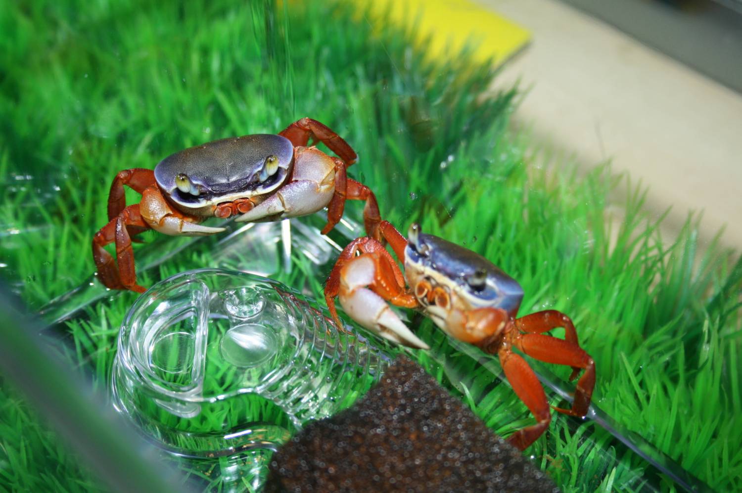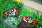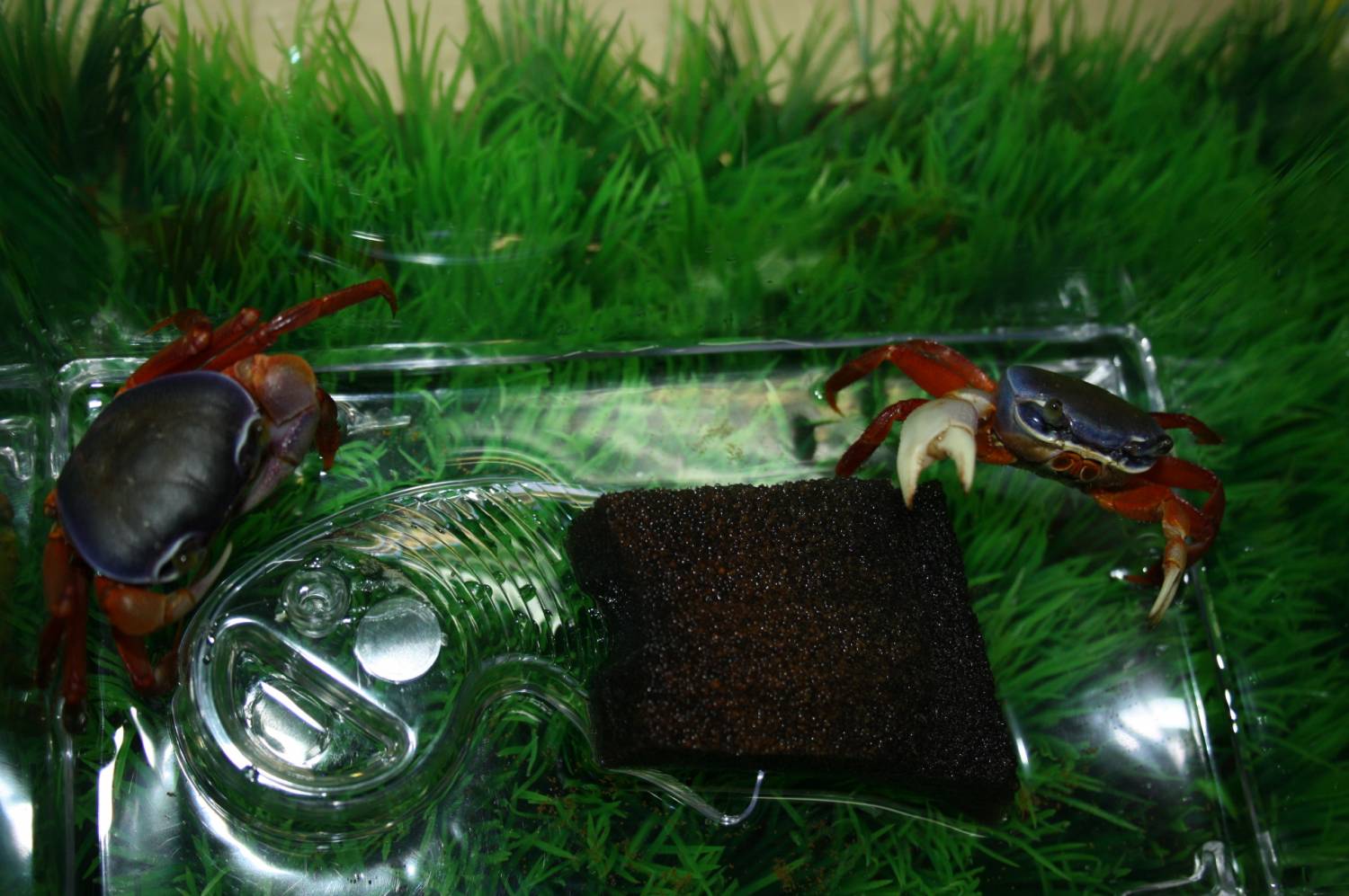 Аквариумные или пресноводные крабы – это одни из самых необычных и занимательных домашних любимцев, которых мы можем предложить Вам сегодня по необычайно низкой и привлекательной цене. Обычно при покупке домашнего питомца его будущим владельцам приходится решать множество дополнительных проблем, связанных с обустройством жилья нового члена семьи, кормлением и уходом за ним, вместо того, чтобы наслаждаться наблюдением за их повадками и забавным поведением. Крабы очень неприхотливы в данном вопросе, им необходим небольшой террариум, в нашем случае-это аквариум – переноска, который вы видите на наших фотографиях и который вполне может заменить им полноценный дом. Крабам, помимо воды, необходима поверхность суши, на которую они могли бы залезать и именно там наиболее удобно их кормление и можно наблюдать их забавное соперничество, этой поверхностью могут стать любые аквариумные гроты, пещерки, просто декор, а для продвинутых аквариумистов это песчаный берег, где крабы смогли бы даже рыть себе норки, как Вы можете это наблюдать в обычной природе.