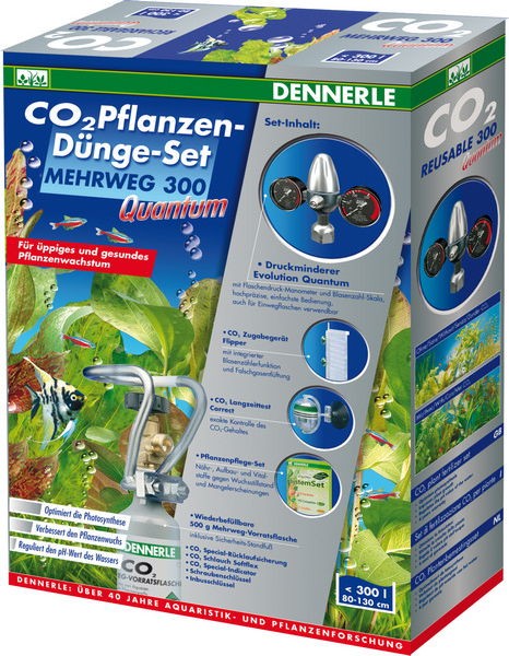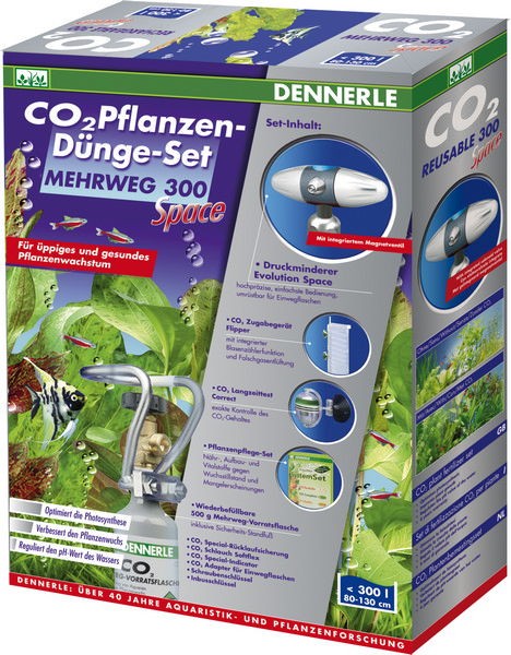 СО2-система для аквариумов объемом до 300 л в составе: заправляемый СО2-баллон на 500 г с подставкой, редуктор Dennerle Evolution Space, адаптер для подключения сменного баллона Dennerle, реактор СО2 Dennerle Flipper, специальный обратный клапан, 2 метра СО2-шланга, длительный тест Dennerle СО2 Langzeittest Correct, комплект специальных индикаторных жидкостей Dennerle СО2 Special-Indicator, гаечный ключ и ключ с шестигранной головкой, комплект удобрений Dennerle PerfectPlant SystemSet. Гарантия - 3 года.