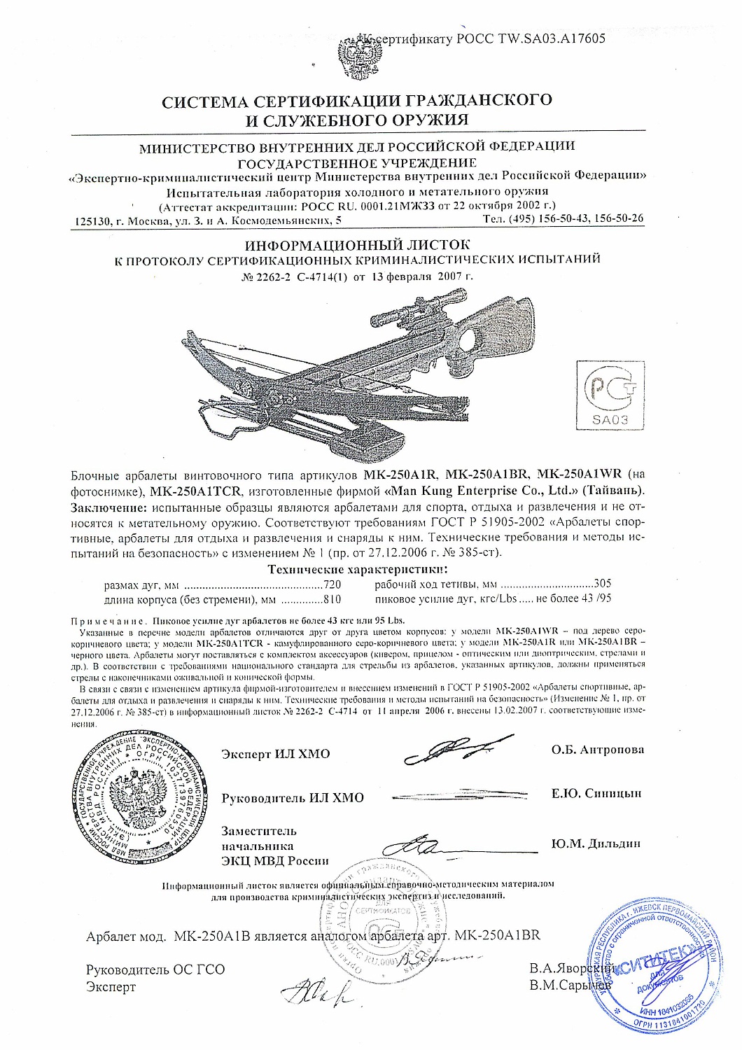 Арбалет отвечает требованиям ГОСТ и имеет соответствующий сертификат (нажмите для увеличения)