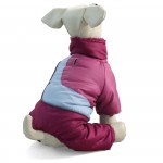 Зимний комбинезон для собак, теплый, подкладка флисовая, наполнитель синтепон. Цвет фиолетовый. Отделан белым воротником из искусственного меха. Застегивается на молнию. Костюм очень легко одевать, за счет молнии на спинке.