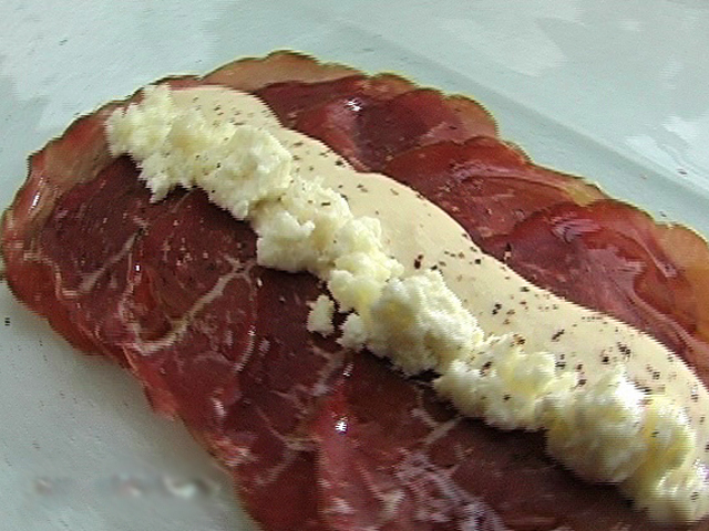 Вкуснейшая сыро-вяленная говядина в сочетании с козьим сыром.Состав:бресаола — 60 гр;козий сыр — 60 гр;сливки — 100-150 гр;соль, перец, оливковое масло, вишневый уксус, горчица — по вкусу.